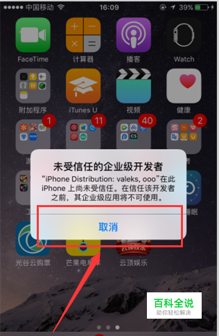 首先我们点击下载一款没有被信任的应用,点击安装,安装完成后,只能点击取消,