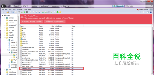 打开后选到update的资料夹、在选到update.rpf、裡面的comon、再裡面的data、最裡面的handing.meta(这个档案就是所有车辆的数据)