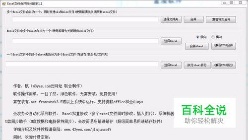 用百度搜索并下载Excel文件合并拆分能手1.1版(切记必须是1.1或以上版本,该软件绿色、免费),下载后运行。