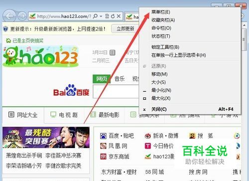 如果是IE9的 ,浏览器上的菜单栏是默认不打开的,所以我们需要右键浏览器的最顶端的空白位置,在弹出的选项中,我们点击“菜单栏” 如图