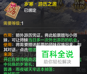 3、上完课后,点击【游历】。 每天5次:系统3次+使用道具游历之邀2次。 每天5次必做,小师妹游历可以解锁图鉴(侠誉录)拿青梅令,还会赠送各种小师妹属性、小师妹时装、名师帖、宋钱、BUFF酒等等。 注意:每次游历之后和小师妹的对话都需要点一下,不要把5次游历全点完后再点对话,对话次数不累计,这样会损失一些信任度,很可惜。 使用道具增加游历次数:召唤出小师妹,按F对话,选择赠送礼物这个选项,把<岁寒·游历之邀>放进去就可以了。送一次点1次对话!