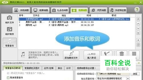 给电子相册视频配上背景音乐和动感歌词字幕 在“背景音乐”选项卡点击“添加媒体文件”按钮,导入想要为电子相册视频配的音乐,然后点击“插入歌词”按钮,导入和音乐匹配的LRC歌词文件。软件会为歌词自动渲染特效动感展示。