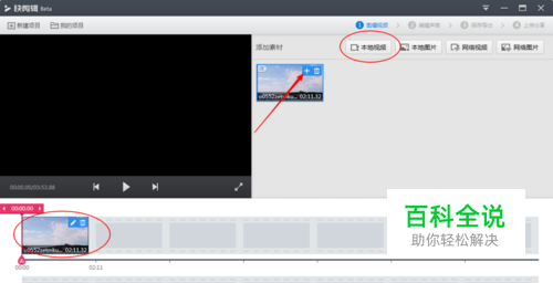 首先第一步将电影素材添加到APP里面,点击本地视频选择下载好的视频,然后打开,添加到软件后还需要点击将它添加到轨道上面来,把光标移动到左侧小视频的上面里面会出现个加号,点击一下就会自动添加到下方的轨道。