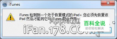 当恢复成功进入时候,电脑桌面会显示检测到一个处于恢复模式的iPad我们点确定。
