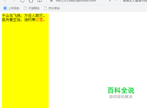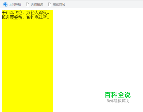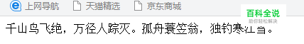 先导入编辑器,一般是记事本写html文档。我们写好基本结构之后,加入css样式。在<body>里加入文字,比如来一首唐诗:“千山鸟飞绝,万径人踪灭。孤舟蓑笠翁,独钓寒江雪。”保存为html文档,然后用浏览器打开。效果图如下: