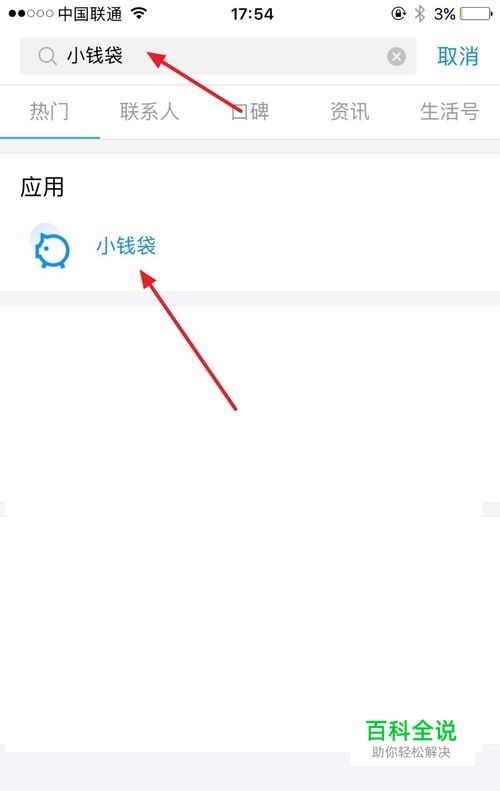 打开手机支付宝,然后在首页的搜索量,输入小钱袋,点击,该应用