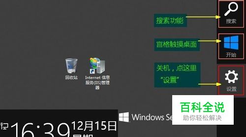 第二步:桌面会同时出现两个灰色方块,左边是本服务器当前时间,右边竖条的分别是“搜索功能”“宫格触摸界面”“设置”,我们要操作关机,所以单击“设置”;