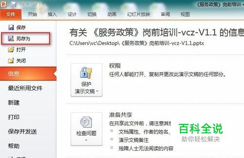 打开你要加密的PPT文档。 点击《文件》——《另存为》;