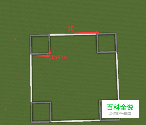 首先建造一个正方形区域,四个角分别是15X15的方形区域。间隔35格。
