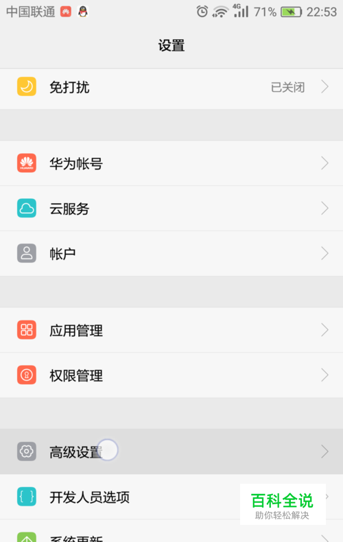 进入手机“设置”(这里以运行emui4.1的华为P8为例),向下滑动找到“高级设置”