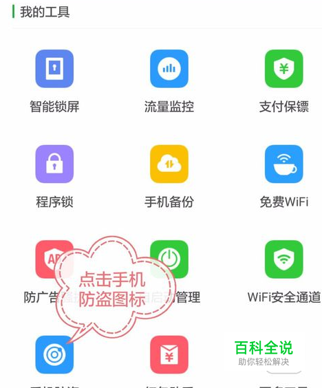 在手机上安装该软件,已经安装好了就可以直接在手机屏幕上找到该软件图标打开; 然后找到该软件界面下方有个工具箱,点击打开,在工具箱内找到手机防盗点击开启防盗。