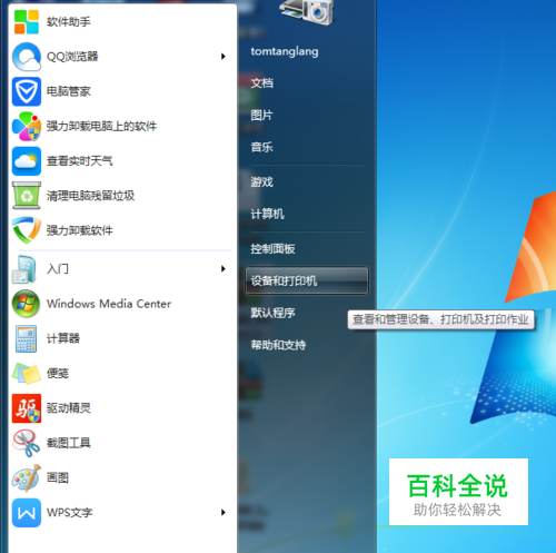 桌面左下角在开始菜单中找到“设备与打印机”,双击打开它
