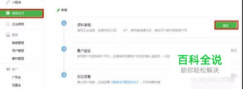 服务号通过认证后,进入商户平台,点击【微信支付】、【开通】按钮,进入微信支付申请入口。点击微信支付按钮后,可以看到页面显示了申请流程:1、资料审核;2、账户验证;3、协议签署等,因此我们先点击右侧的【填写】按钮进行资料填写。
