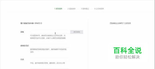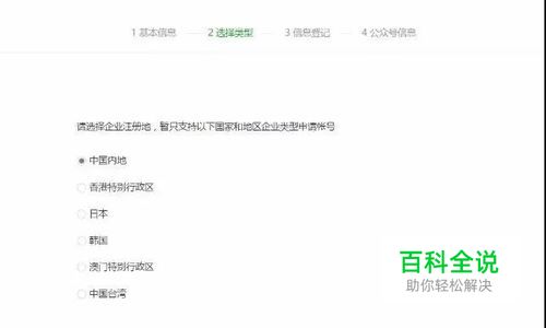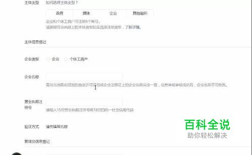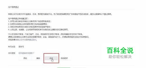 进入信息登记页面。 选择账号主体类型,在“政府”、“媒体”、“企业”、“其他组织”四个选项中勾选一项,一般都会选择【企业】类型。