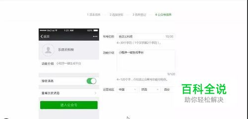 确定之后,就会进入最后一步——公众号信息登记。 依次填写完“账号名称”、“功能介绍”、“运营地区”之后点击完成。