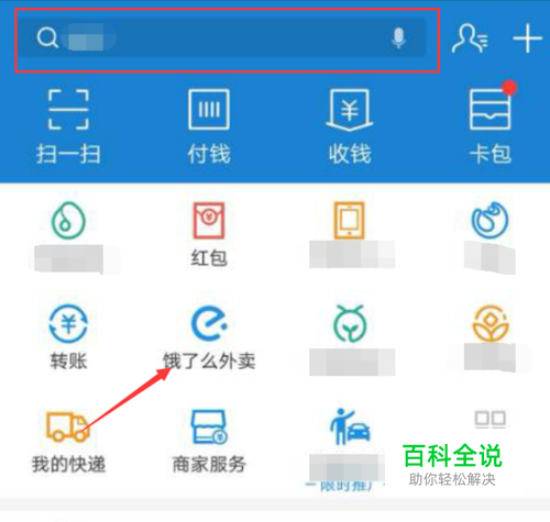 打开该支付应用,在常用功能区,可能有外卖进入方式,如果没有,上方有快速搜索处,进行查找即可。