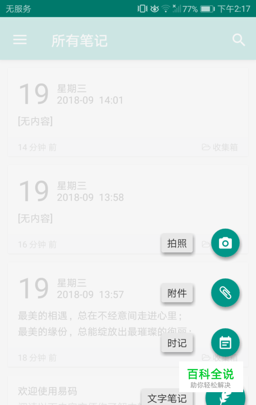 打开易码软件的主界面,点击左侧的添加按钮,会显示以拍照、附件、时记、文字,以下这几种形式做的笔记,如图所示