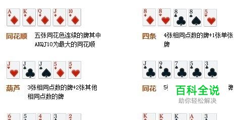 牌型大小规则: 同花顺 > 四条 > 葫芦 > 同花 > 顺子 > 三条 > 两对 > 对子 > 高牌, 小贴士:四种花色无大小区分,先比较牌型,再比较点数,如果点数相同,则大小相同。