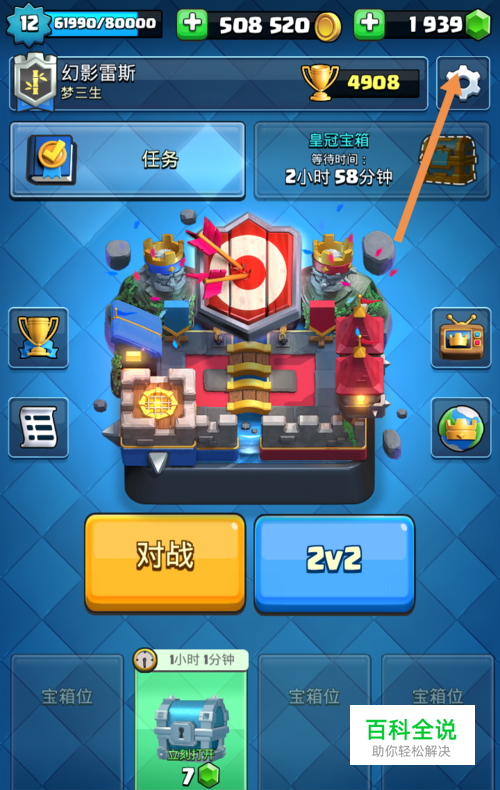 首先打开皇室战争,然后点击下图中箭头标注的位置。