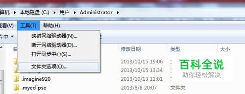 打开C盘——》用户——》Administrator目录下(C:\Users\Administrator),选择“工具——》文件夹选项”,设置隐藏文件夹为显示。