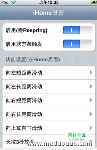 4.黑屏幕状态下必须用HOME激活屏幕吗? 其实不是的,不知道大家有没有发现关机键是可以即时锁屏 也可以即时开屏的,所以说可以彻底告别HOME物理按键了。 下面写下教程 首先下载安装IHOME主程序,然后安装桌面重启 和 后台运行 (后两个不是必须安装,但是为了使功能全面化尽量安装吧)。然后大家会看到小房子的图标,进出把 启动项全部勾选。这个时候IHOME就可以使用了,下面设置是然你按照个人习惯更改的,完全可以不改,默认的不错! 这个时候你会发现,在你屏幕最下面,最最下面用手触摸会出现黄色的线条,在音乐 视频 、照片 ITUNES那里 。这个就是触发条,这回你就可以告别HOME,轻轻的从右向左滑就可以退出,从左向右就可以锁屏,按开机键即可开屏,是不是完全用不到HOME了。
