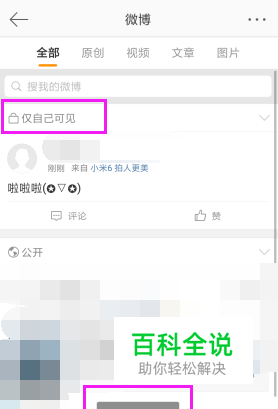 设置成功后,页面那条微博上就标注有“仅自己可见”。