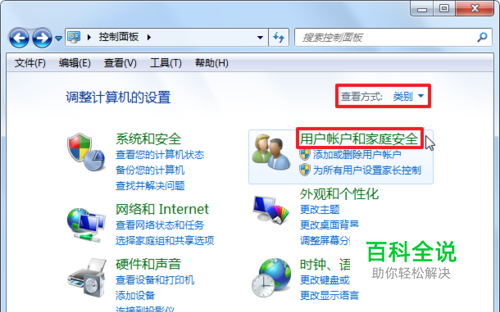 点击电脑左下角“开始”按钮,然后点击右侧“控制面板”。 控制面板右上角查看方式,选择“类别”,然后点击“用户帐户和家庭安全”。