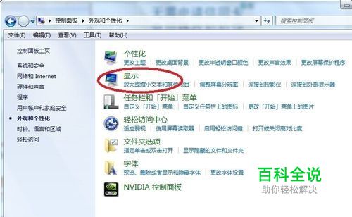 点击【外观和个性化】选项,进入控制面板个性化界面,在左侧菜单栏里可以看到【显示】选项,如下图所示。