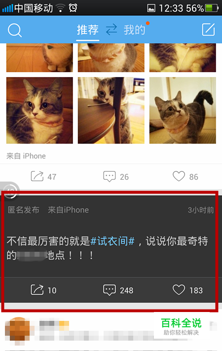 点击进入匿名微博, 在手机屏幕下方有转发,点击【转发】。