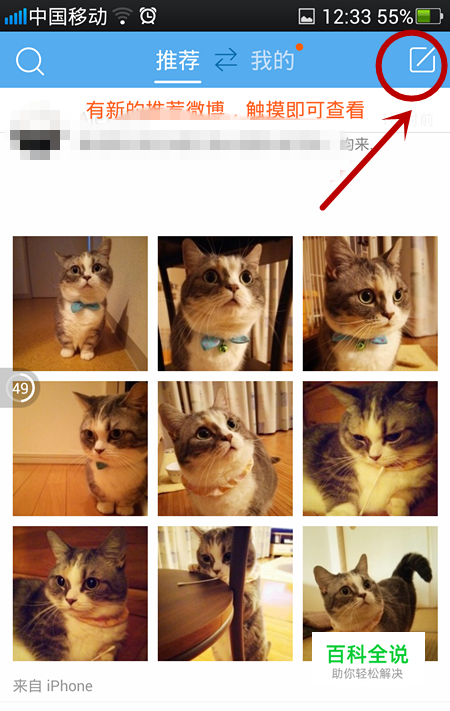 打开微博客户端,记得需要更新到微博的最新版本。然后 点击右上角的写微博的图标,进行微博发布。