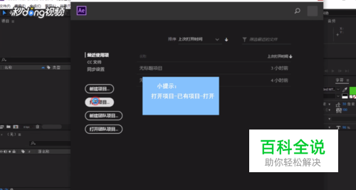 打开Ae,点击“打开项目”,然后选择一个已有项目,点击打开。
