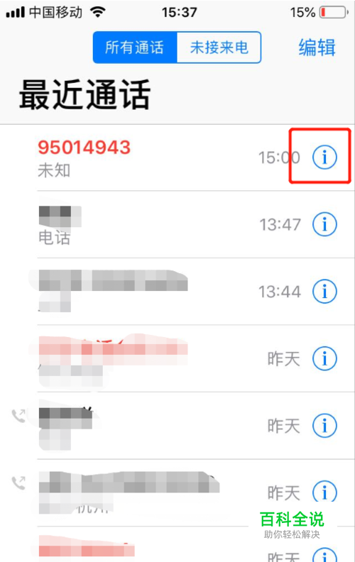 打开通话记录,点击需要设置为黑名单的电话右侧小圆圈,如图: