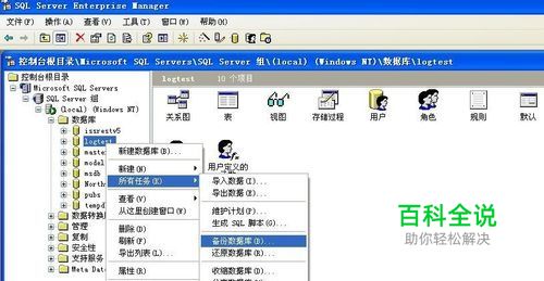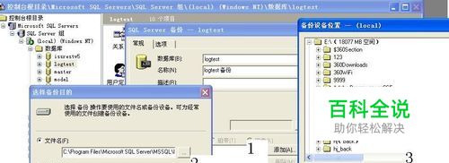 下面以数据库logtest为例 在压缩前先对数据库进行备份,打开企业管理器--单击选中要备份的数据库--右键单击--所有任务--备份数据库--单击‘添加’--选择备份文件存放路径--填写备份文件的名称