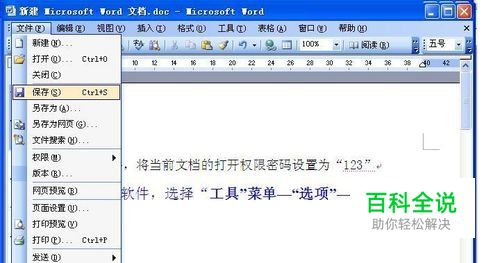 如何将Word文档的打开权限密码设置为“123”