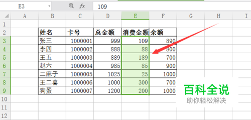 选中第一个消费金额的109,在右下角有个黑色+字形,用鼠标点中,然后向下拖动,这样就可以全部引用消费金额的相应数据了,或者可以先复制第一个消费金额109的单元格,然后粘贴到其他要引用的单元格。如下图所示。