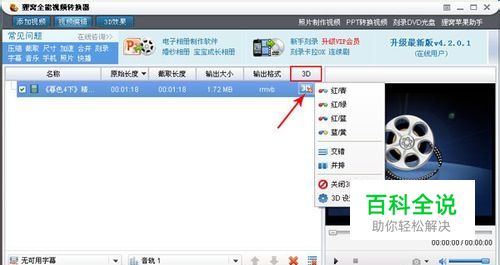 3D效果设置,在软件主界面就有3D功能,通过单击主界面的3D图标,可快速选择3D格式,如果不需要预览视频效果的朋友,可直接从此处快速选择3D格式。