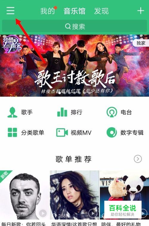 使用账号密码登录QQ音乐,在首页点击左上角的三个横杠,点击进去。