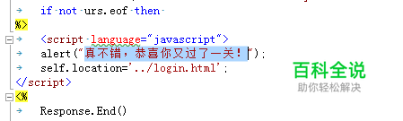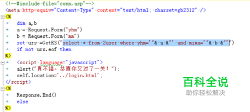 结果就是一样会提示恭喜又过了一关。为什么会这样呢?那么现在我们来分析一下。在后台程序,我们用SQL 【select * from 2user where yhm='"& a &"' and mima='"& b &"'】 验证用户名和密码。其中a和b为用户填写的用户名和密码,不明白的可以参看第二张图片整个后台验证代码。