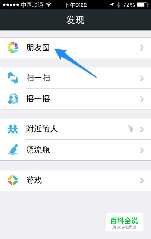 打开微信后,还是在 “发现”栏目中点击 “朋友圈”选项,如图所示