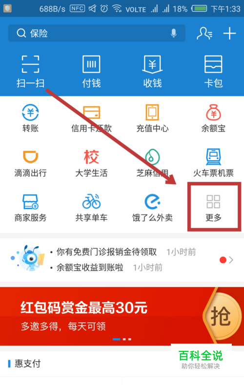 打开支付宝,在界面右侧找到【更多】,点击进入。