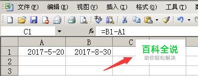 在箭头所指的单元格中输入=b1-a1,按回车键;相差天数计算结果如图所示;