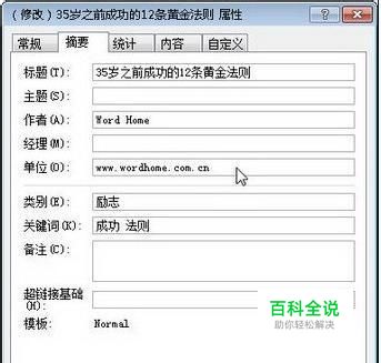 在打开的文档属性对话框中切换到“摘要”选项卡,分别输入作者、单位、类别、关键词等相关信息,并单击“确定”按钮即可,如图2所示