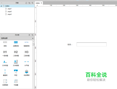 在原件库中分别向编辑页面拖入文本标签和文本框,文本标签我们命名为“姓名:”;