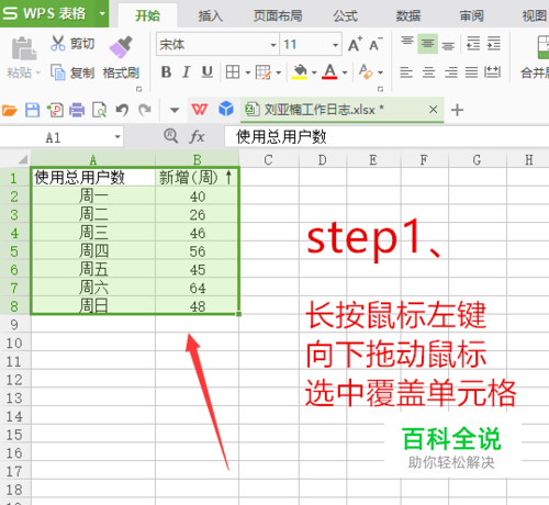 step1、 长按鼠标左键,向下拖动鼠标,使脸色边框区域选中覆盖需要操作的单元格。
