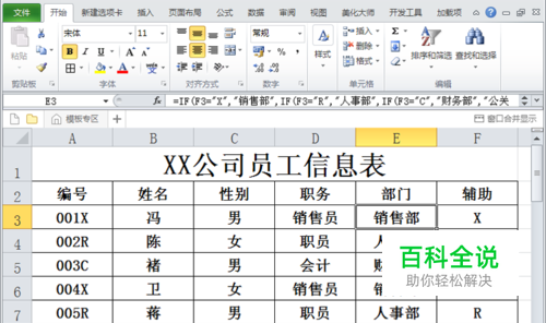 通过员工编号判断所属部门,假设编号末尾代表部门,“X”代表销售部,“R”代表人事部,"C"代表财务部,“G”代表公关部。选择单元格f2输入辅助。