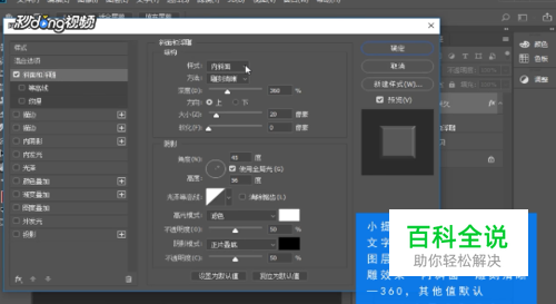 双击右边的文字图层,在弹出的图层样式中,给文字添加斜面和浮雕效果,样式为内斜面,方法为雕刻清晰,深度360,大小20,角度45,高度56,其他值默认,单击确认。