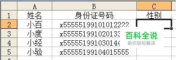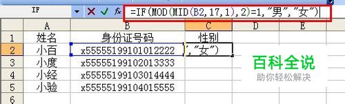 在C1单元格中输入“=IF(MOD(MID(B2,17,1),2)=1,"男","女")”,按回车,可以自动判断并显示对应身份证所属者是“男”或者“女”。 (MID(B2,17,1)表示提取B2单元格中第17位位置的字符; MOD(MID(B2,17,1),2)表示求B2单元格中第17位位置的字符与2的余数; 整个公式表示判断B2单元格中的第17位位置的字符与2相除是否等于1,如果等于1,即17位位置的字符为奇数,则判断并显示为“男”,如果不等于1,即17位位置的字符为偶数,则判断并显示为“女”。