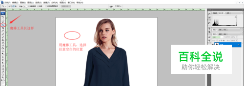 在左侧工具条中选择魔棒工具,然后在图片的白色部分点击,图片中的白色区域就会被选中。但是我们仔细观察会发现,还是有一些白色区域没有被选中,如图所示,接下来我们要把这几处白色区域也给选上。