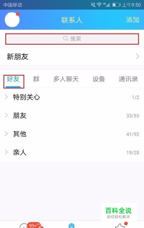 首先从手机上登录我们自己的QQ,在登进去后首页的好友页面,顶端有一个搜索框,大家找到这个搜索框。