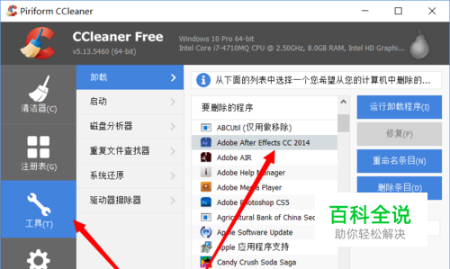 打开软件“CCleaner”。选择左边的“工具”在要删除的程序下面找到你要卸载的AE版本,我这里演示的是卸载2014的CC版本。